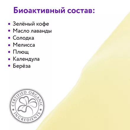 Состав: (INCI) Aqua, Coffea Arabica (Coffee) Seed Extract, Glycyrrhiza Glabra (Licorice) Root Extract, Melissa Officinalis Extract, Hedera Helix (Ivy) Extract, Calendula Officinalis Extract, Betula Alba Leaf Extract, Panthenol, PEG-40 Hydrogenated Castor Oil, Sodium Laureth Sulfate, Niacin, Lavandula Angustifolia (Lavender) Oil, Benzyl Alcohol, Methylchloroisothiazolinone, Methylisothiazolinone