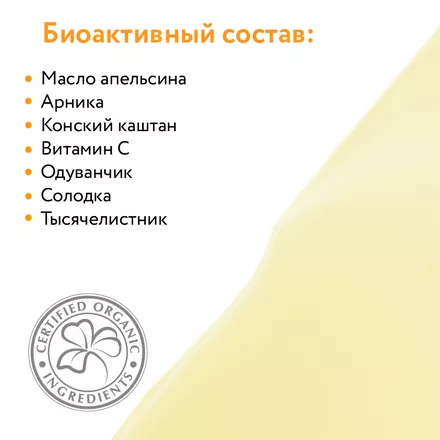 Состав: (INCI) Aqua, Vitis Vinifera (Grape) Leaf Extract*, Arnica Montana Flower Extract, Aesculus Hippocastanum (Horse Chestnut) Seed Extract, Achillea Millefolium Extract, Hypericum Perforatum Extract, Panthenol, Taraxacum Officinale (Dandelion) Extract, PEG-40 Hydrogenated Castor Oil, Sodium Laureth Sulfate, Citrus Aurantium Dulcis (Orange) Oil, Sodium Ascopbyl Phosphate, Benzyl Alcohol, Methylchloroisothiazolinone, Methylisothiazolinone