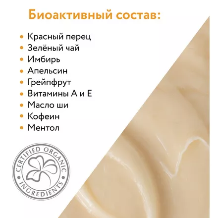 Антицеллюлитная кремовая маска для кожи тела с мягким термоактивным эффектом. Высокоактивный натуральный комплекс органических экстрактов растений ускоряет обменные процессы, выводит токсины и избыточную жидкость, позволяет значительно уменьшить проявления целлюлита. Увлажняет, насыщает кожу минералами и витаминами, оказывает укрепляющее действие.