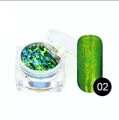 Спрессованные хлопья имеют ярко выраженный эффект хамелеона, и втирка меняет свой цвет в зависимости от угла наклона и освещения. Продукт можно аккуратно уложить на ноготь, а можно легким движением растереть в пыль для самостоятельного плотного покрытия.
