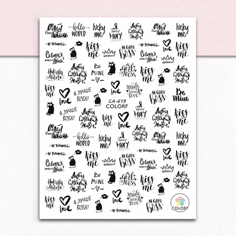 Рисунок выполнен на сверхтонкой эластичной пленке с клейкой основой, которая надежно закрепляет изображение на ногтевой пластине.