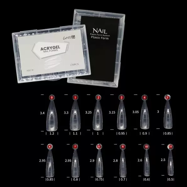 Многоразовые пластиковые формы для наращивания ногтей. В технологии верхних форм материал (гель или акрил, Комби Гель) выкладывается внутрь специальной пластиковой формы, которая переворачивается и прикладывается материалом к ногтю. Главный плюс данного метода нанесения - отсутствие опиливания поверхности искусственного ногтя.