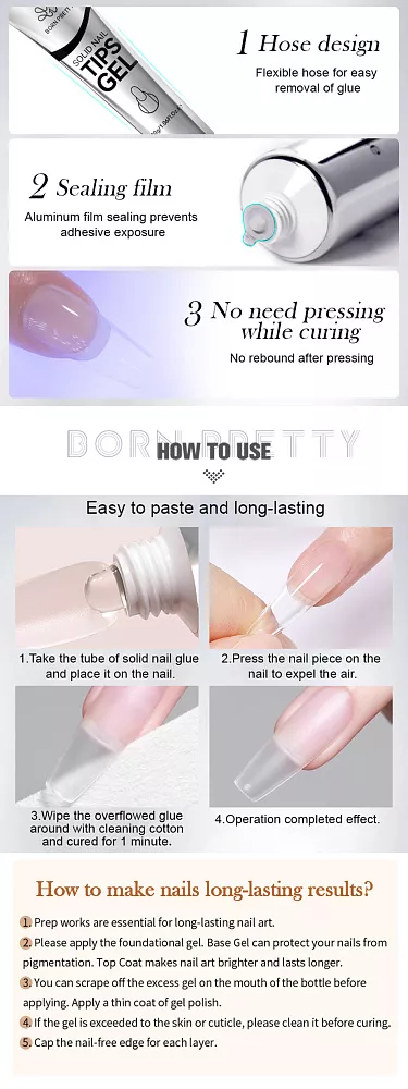 4. Приложите гелевую типсу внутренней поверхностью к гелю и прижмите, начиная от задней части ногтя, пока типса не совпадет с поверхностью ногтя.