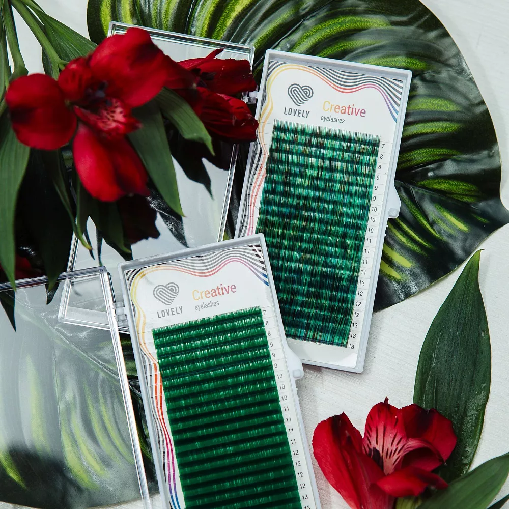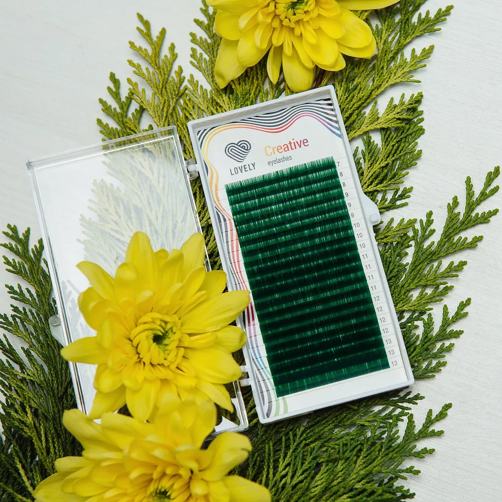 Цветные ресницы Lovely в оттенке Green можно использовать как в качестве основного цвета, так и как акцент при черном или коричневом наращивании.