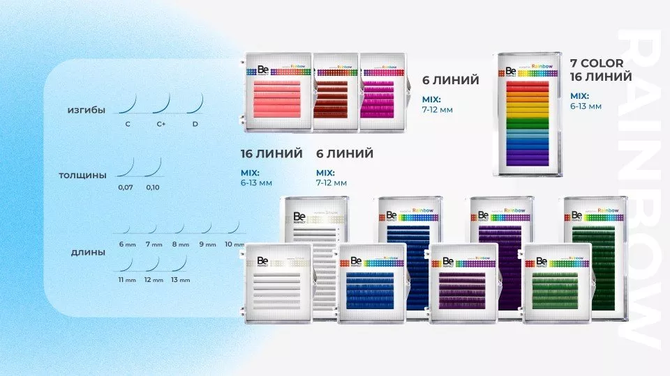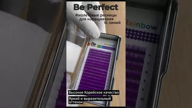 Ресницы Be Perfect Rainbow применяются при наращивании ресниц профессиональными лэшмейкерами. Современное волокно позволяет добиться идеального изгиба, при этом ресницы не ломаются и легко снимаются с ленты, на которой благодаря плотному расположению помещено максимальное количество ресниц.