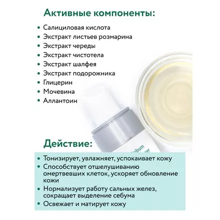 Балансирующий тонер для лица предназначен для жирной кожи. Гидролаты растений (розмарина, череды, чистотела, шалфея, подорожника) оказывают тонизирующее, противовоспалительное, успокаивающее и увлажняющее действие. Салициловая кислота способствует отшелушиванию омертвевших клеток, ускоряет выравнивание и обновление кожи. Средство улучшает микроциркуляцию, сокращает выделению себума, нормализует работу сальной железы, подавляет воспалительные процессы, минимизирует следы постакне. Быстро и надолго освежает и матирует кожу.